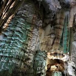 Phong Nha Höhle mit dem Boot besichtigt. Riesige Höhle mit künstlerisch anmutenden Gesteinsformationen. Eine sieht aus wie ein Löwe, andere wie riesige Quallen oder Tintenfische.