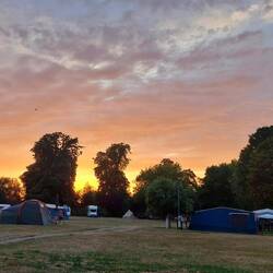 Hier auf dem Campingplatz ist was los, ab halb acht sind alle Kids hier wach und toben über die Wiese, spielen Fußball und suchen mit dem piependen Metalldetektor nach Gold im Bach, der hinterLäs mer