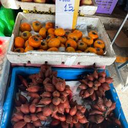 Ich war um 8:20 Uhr dort und es war einiges los. Der Markt ist in einer Art Halle. Eigentlich mehrere Hallen, die miteinander verbunden sind. An großen Schildern wurde angezeigt, in welcher Richtung Blumen, Obst, Gemüse, Schwein, Hühnchen, Rind, Fisch und Lebensmittel (das umfasste Nudeln, Reis, Kekse und Ähnliches) sind. Danach konnte man sich ungefähr orientieren. Die Übergänge waren jedoch fließend. Wenn der Boden nass wurde, wusste man, dass man in den Fischbereich kam.