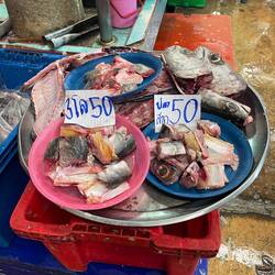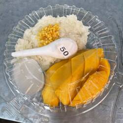 Es gab viel zu viel Fleisch und entsprechend lag der Geruch in der Luft. Da verging mir etwas der Appetit. Ich wollte hier auf jeden Fall frühstücken, aber das was in den Töpfen war, sah sehr scharf und fleischig aus. Ich war mir auch unsicher was drin war und wenn ich nachfragte, halfen die Antworten teilweise nicht wirklich weiter, da sie die Thai Namen der Gerichte sagten. Nun gut. Ich entschied mich für ein solides Sticky Rice mit Mango. Das geht immer und es ist nicht schlimm, wenn es schon eine Weile ungekühlt rumsteht. Achso, Apropos Kühlung: es werden auf die zu kühlenden Dinge (Fleisch, Fisch, Getränke) einfach Eiswürfel gepackt. Manchmal wird es auch vergessen. Damit ich mir keine Kotzeritis einhandle, lasse ich davon die Finger.