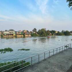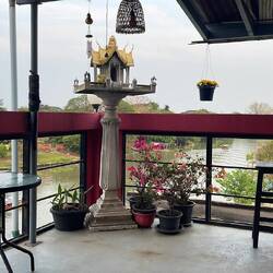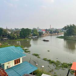 Zum Frühstück schnitt ich mir eine Drachenfrucht und zwei Rose Apple und setzte mich damit auf die Dachterrasse von meiner Unterkunft in Ayutthaya. Es war etwas diesig und bereits sehr warm. Ich ließ mir an dem Morgen Zeit, denn mein Plan war lediglich zur heißen Mittagszeit in einem Bolt Taxi nach Bangkok zu sitzen. Also las ich in meinem Buch und guckte immer mal wieder auf den Fluss und das Treiben des Marktes vor dem Gebäude.