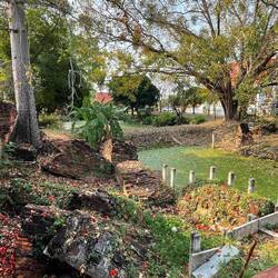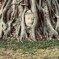 Die Tempelanlagen und ihre Grundmauern sind gut erkennbar, jedoch sind nur Überreste von Buddha-Statuen zu sehen. Meist sind nur die gefalteten Beine zu erahnen. Die Burmesen haben denen damals die Köpfe abgeschlagen, zur Machtdemonstration, dabei sind viele Oberkörper ebenfalls kaputt gegangen. Gläubige Buddhisten hatten die Köpfe dann bei einem Tempel in der Erde vergraben, damit sie nicht geklaut werden. An einer Stelle ist einer der Buddhaköpfe mitsamt der Baumwurzeln wieder aus dem Boden „herausgewachsen“. Dieser Kopf, inmitten der Baumwurzeln ist nun verständlicherweise sehr heilig, da er sozusagen durch die Natur wieder auferstanden ist und man darf sich davor nicht höher positionieren, als der Kopf ist. Das ist gar nicht so einfach. Also habe ich ein Foto im halb liegenden Sitzen gemacht. Wenn man eines im Stehen macht, wird man mit Trillerpfeife sehr lautstark ermahnt. Da ist ein Mann, der nur dafür dort sitzt und Acht gibt.