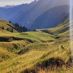 Ein Radfahrer holte uns dann ein der dann zu einem anderen Hof fuhr. Als wir den ersten Aufstieg hoch liefen. Konnte man aus Richtung Oberstdorf schon einen leichten Schimmer des Sonnenaufgangs sehen. Sehr schön. Vor uns sahen wir eine Taschenlampe herum irren, wahrscheinlich ein anderer Wanderer. Aber dann war das Licht weg, wahrscheinlich ist er wo anderst hin gelaufen.