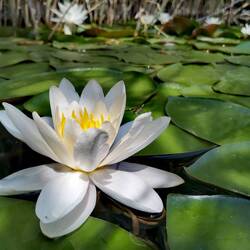 Dichte Wasserpflanzen Teppiche werden durch blühende Teichrosen Kolonien aufgehübscht, auf deren Pizzateller großen Blätter, sich der flauschige Blässhuhn Nachwuchs ausruht - schon irgendwie putzig, die kleinen Geier.