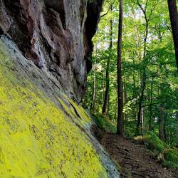 Es ist einfach herrlich, nahezu ausschließlich auf sandigem Waldboden zu laufen und die schmucken Buntsandstein Formationen, welche Pfälzer Landschafts Architekten ganz offensichtlich in regelmäßigen Abständen ins dichte Grün drapiert haben, machen richtig was her.