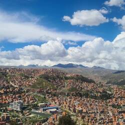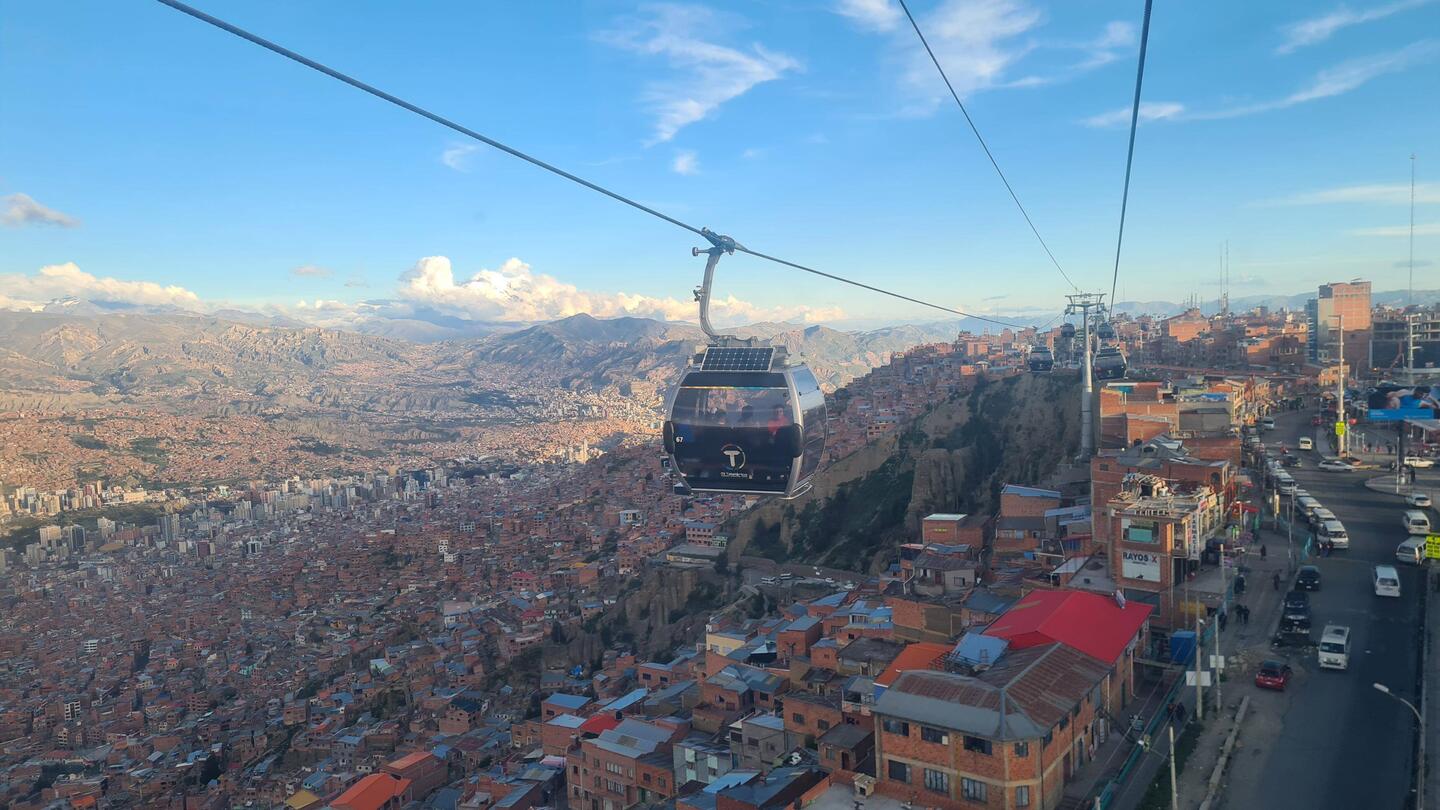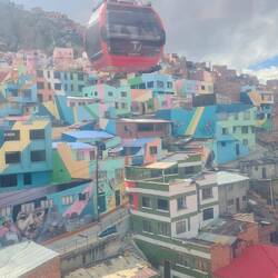 After eventually recovering we actually got to do a bit of exploring. La Paz is actually a completely insane city: La Paz is in a valley, but which is at such high altitude that craggy rocks just emerge here and there. There's a huge canyon running down the middle, and then the city grows up the cliffside until you finally get to the precipitous cliff edge and then Él Alto at the top on the plateau. We took the teleferico, which is probably one the best public transport systems we've ever seen (incredibly cheap, clean, efficient, not overcrowded and extra points for both uniqueness and incredible views) all the way round the city. You can do a huge loop which gives amazing views of the city.