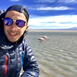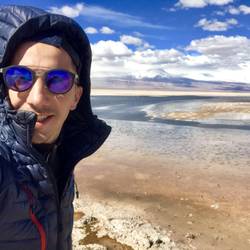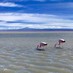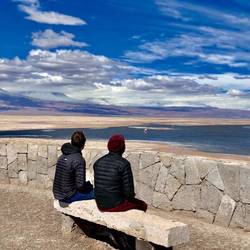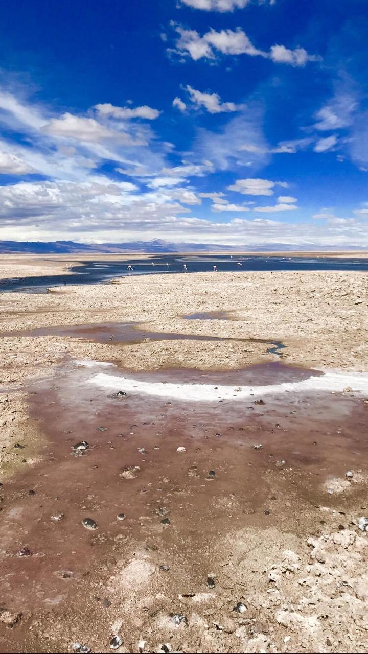 Cette nuit a été plutôt agréable, même si une voiture s’est installée prêt de nous vers 00h, musique assommante , improbable en plein désert. Nous continuons la visite des différents sites par la laguna Chaxa. Cette lagune a la particularité d’héberger des colonies de flamants roses, la nourriture y est abondante et ces oiseaux en raffolent « brine shrimp ». En effet, cette espèce assez similaire au plancton, se reproduit en grand nombre ici et donne aux flamants le pigment rose qui les définit. Leurs œufs sont très résistants aux mauvaises conditions climatiques, c’est pourquoi ils n’ont pas de mal à s’acclimater à ces variations extrêmes de températures. Nous apprendrons durant la visite que cette zone est la plus sismique et la plus volcanique du monde, elle est surnommée « l’anneau de feu ». En effet la région héberge plus de 150 volcans en activité, cela représente 10% de la totalité des volcans actifs sur la planète. Ce phénomène est dû à la superposition de 2 plaques tectoniques, celle d’Amérique du sud et de Nasca, il y a 35 millions d’années. L’un des volcans « Lascar » a eu rien que ces 30 dernières années, plus de 30 éruptions, faisant de ce volcan le plus actif de Chili. Le paysage est magique, voir des flamants roses dans ce cadre naturel, au milieu de différentes nuances de couleurs et ce sel toujours omniprésent, c’est fabuleux. Nous poursuivons la visite par deux autres lacs plus au sud. En chemin nous nous rapprochons du volcan « lascar », il est impressionnant de diamètre, sa base est énorme. Nous avons l’impression de pouvoir l’escalader via une simple randonnée, mais c’est tout de même un sommet de presque 6000. La route nous rapproche toujours plus prêt de cette chaîne volcanique, jusqu’à avoir de la neige sur les plaines. À notre grand regret les conditions météo se gâtent et la route est barrée. Afin de profiter du cadre et du coucher de soleil, nous nous arrêtons non loin de là faire une pétanque, le cadre est juste fabuleux. Nous sommes au pied de deux volcans immenses, qui dégagent une force incroyable, les nuages au dessus de leurs têtes forment comme un « cyclone », c’est tout simplement impressionnant. Les couleurs lors du coucher de soleil sont sublimes, malgré le froid glacial c’est un vrai régal. Nous dormirons non loin de là, un peu plus en contrebas car le vent est trop violent ici, rendant l’air difficilement supportable. Une fois de plus, quelle journée incroyable ... on se souviendra d’Atacama !En savoir plus