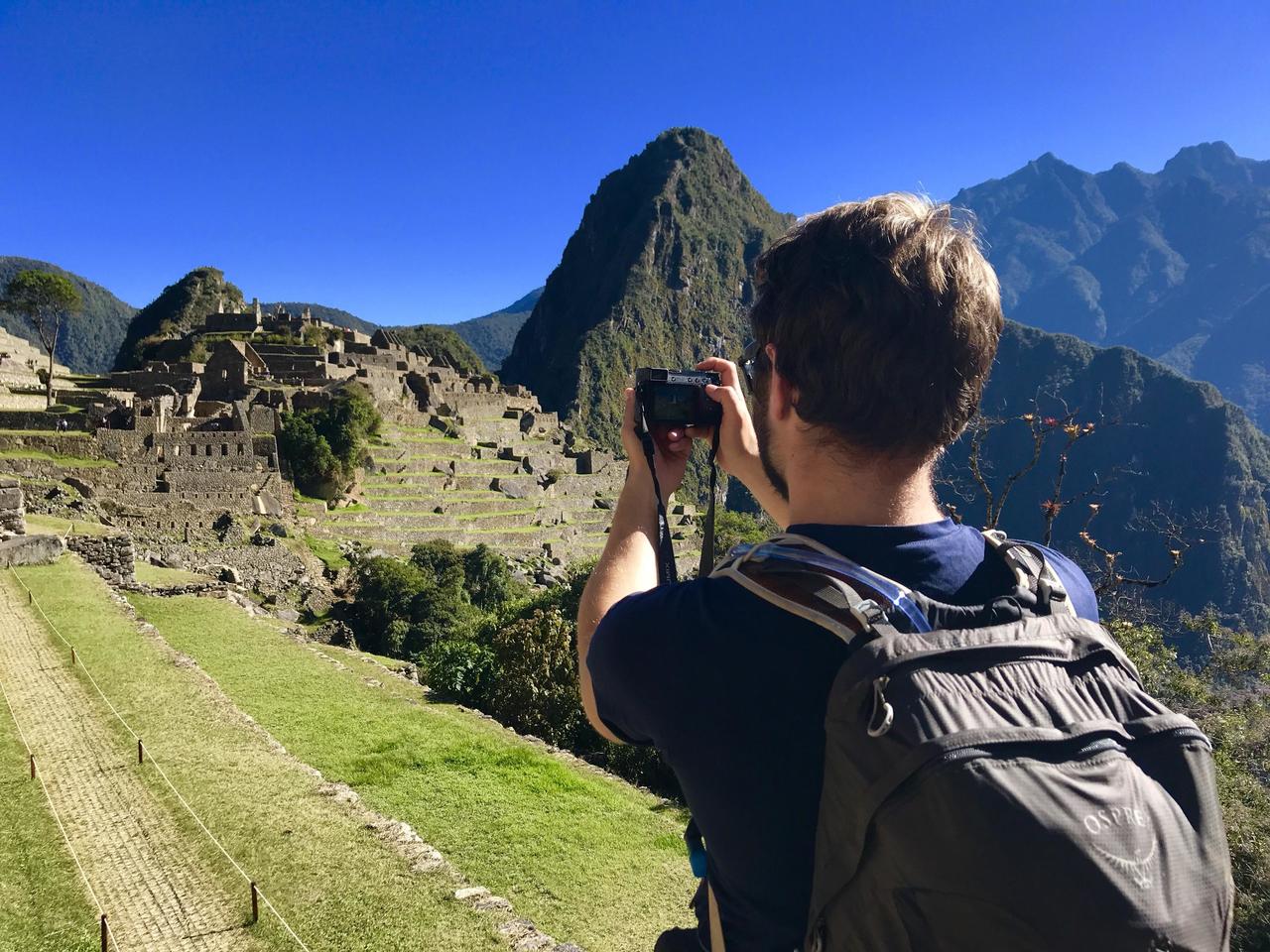 Ce matin c’est réveil à 4h du matin pour un départ à 4h30. Nous sommes un peu fatigués mais l’excitation du moment comble tout les petits désagréments. Départ donc de nuit, l’ascension prend environ 1h30 pour arriver aux portes du Machu Picchu, là le guide nous attend avec un petit drapeau bleu afin de reconnaître notre groupe. Il y a actuellement environ 3000 visiteurs par jour, contre 7000 en haute saison (juillet et août). Le temps est sublime, les premières lueurs du jour laissent entrevoir les montagnes qui se dessinent autour de nous. Sans être entré dans l’enceinte du Machu Picchu, le site est déjà incroyable, un grand monticule entouré par les montagnes, la jungle, puis la neige sur les monts les plus hauts. Une fois à l’intérieur c’est abasourdis que nous entamons la visite. Comment un tel édifice a pu être construit il y a plus de 500ans dans de telles conditions. À l’image des pyramides en Egypte, c’est une prouesse architecturale incroyable. Le site est dans un tel état de conservation que l’on se demande comment cela peut faire 500ans. Notre guide (en anglais) est génial, il arrive à nous transmettre sont intérêt pour l’histoire de ce lieu emblématique. De temps à autre il nous pose des interrogations orales pour savoir si l’on suit bien le récit de cette civilisation perdue. Cette époque est tellement passionnante que tout le monde est à l’écoute, à l’affût de la moindre anecdote croustillante. La visite se fait sous forme de circuit à sens unique, nous nous arrêtons à différents sites majeurs afin d’être éclairés sur le sujet. Nous en prenons plein les yeux, chaque détail a été pensé, l’apport en eau vient directement des glaciers, certains cours d’eau ont été détournés afin de desservir le Machu Picchu, ainsi 2L d’eau par seconde irriguent les cultures. Les cultures représentent ici 60% du site, tout était fait afin d’être autonome. Le reste est constitué de maisons, de temples ou de places destinées au marché ou aux représentations. Les cultures, disposées en terrasses afin de gagner en espace, sont faites de telle manière que la température diffère entre les différents étages. Les étages hauts étaient les plus froids, ils servaient donc à cultiver des pommes de terre