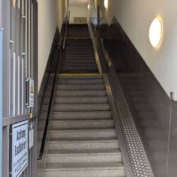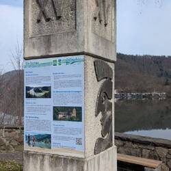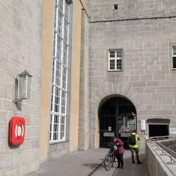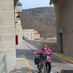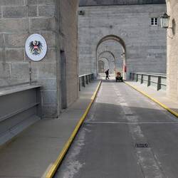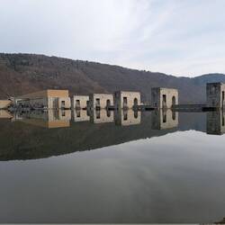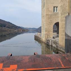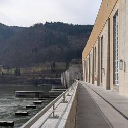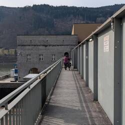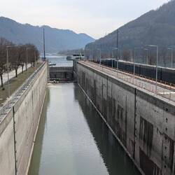 Über 45 steile Treppenstufen geht's am Kraftwerk Jochenstein hoch über die großen Schiffsschleusen Kammern und dann weiter über die Donau ans andere Ufer.