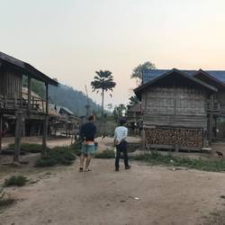 After 2 more hours we arrived at a small village of the Khamu minorities where we would spend the night. After rest and yoga we visited the village and went around. The town is quite simple, but it features rice storage facilities, a school and the house of the village chief. Everybody smiled and treated us with joy. :-) We didn’t really have the ability to converse with the locals, but our guide Wath told us lots about village life. The villagers chose to become an eco tourism village, meaning they actively decided to be visited by tourists. Our guide Wath reported that he had previously asked villagers about whether they thought they made a good choice and whether they are still happy to be visited. Apparently they are, saying that the money they receive from sleepover tourists (like us) is shared amongst all villagers and has raised living standards. For example, they have set up a fund from the earnings and now provide “mini loans” to villagers and are also able to pay for better health care and school supplies.