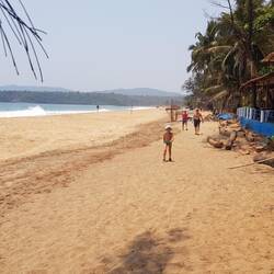 Die zwischen den Hütten wachsenden Palmen spenden Schatten und wenn wir die wenigen Meter über den heißen Sand des Agonda Beach laufen, können wir im fast zu warmen Meer baden.