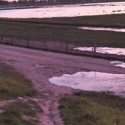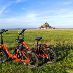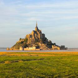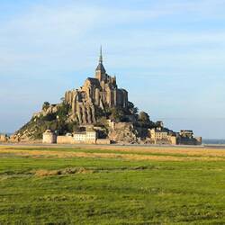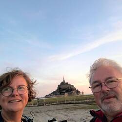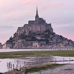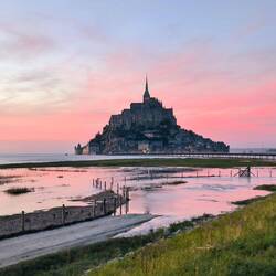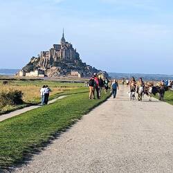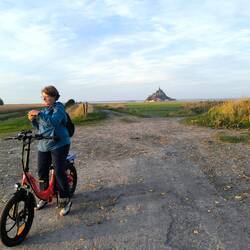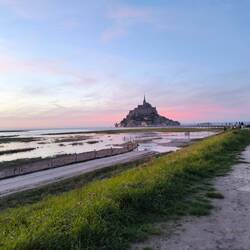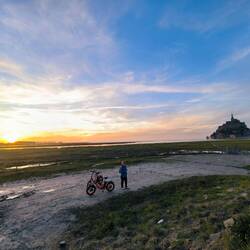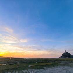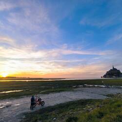 Dann haben wir überlegt wir fahren an eine Stelle wo man Mont-Saint-Michel aus einen anderen Perspektive anschauen kann. Auf die Fahrräder und los - wir kommen an einer Familie vorbei die mit 2 Kindern und 3 Eseln zu Fuß von der Insel kommen - wir fahren weiter was für ein Ausblick - das Wasser kommt und es rauscht in der Ferne und nach einiger Zeit überlegen wir wir fahren doch noch zur Brücke wegen dem Sonnenuntergang. Gesagt getan - wir sind nicht über dem Damm gefahren sonder unten auf dem landwirtschaftliche Weg . Tolle Aussicht tolles Licht .... aber das Wasser kommt in einer Geschwindigkeit auf uns zu .... holla die Waldfee - nix wie rauf auf den Damm - wir glauben es kaum aber unser Weg ist in 10 Minuten unter Wasser und es steigt und steigt - aus den Wiesen sind riesige Wasserflächen geworden.