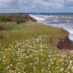 Wir verlassen Wustrow und nähern uns der Steilküste die uns bis Ahrenshoop begleiten wird! Die Strecke unterhalb der Steilküste ist auf 4 km komplett gesperrt, es hat in letzter Zeit zu viele Abbrüche der 20 m hohen Wand gegeben! Der schmale Pfad oben an der Kante soll auch nicht betreten werden! An einigen Stellen trauen wir uns doch nach vorne und sehen wer von den vielen Abbrüchen profitiert,die Uferschwalben! Die brüten in der Steilwand und fliegen zu hunderten umher!