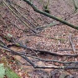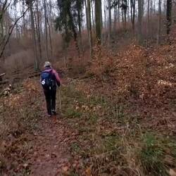 Auf geht's und uns erwartet eine längere Rutschpartie! Der abschüssige und nasse Lehmboden im Wald, ist mit einem dichten Teppich aus Blätten bedeckt! Irgendjemand ist heute vor uns hier gegangen, oder sagen wir besser gerutscht! Es sieht aus als hätte die Person mehrfach den aufrechten Gang aufgeben müssen, das blieb uns trotz einiger Versuche erspart!
