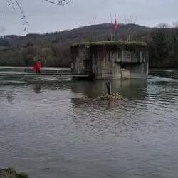 Zum Start der heutigen Tour nutzen wir die Möglichkeit, auf der ersten deutschen Insel im Rhein, bis zum Wasserkraftwerk Albbruck zu laufen! Diese Insel ist ein wahres Biberparadies, wo wir auch hinschauen: Bissspuren! Wir wechseln auf die schweizer Seite und gehen an der toll angelegten Fischtreppe vorbei Richtung AKW Leibstadt! Ganz in der Nähe des AKW treffen wir auf den ersten Bunker! In einer Nische steht eine kleine Bank und hier machen wir unsere erste Pause!