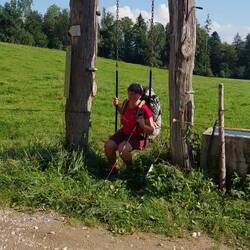 Zwischendurch rufen wir immer mal wieder den von uns anvisierten CP in Lindenberg an, keiner geht dran!🙄 Irgendwie haben wir uns auch mit den zu gehenden km verrechnet und werden deshalb auch nicht pünktlich am CP sein, der schließt um 18 Uhr! Wir planen um, aber finden erst nach einigen Telefonaten in Scheidegg eine tolle und großzügige Ferienwohnung, nicht gerade preiswert aber die nehmen wir! Die 24 km bei der Hitze und den langen Steigungen haben uns sehr zugesetzt! Völlig fertig erreichen wir Scheidegg und unsere Vermieterin erwartet uns schon mit herrlich gekühlten Getränken!