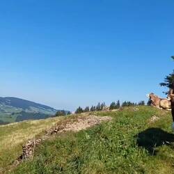 Wir werden den halben Tag über Almen mit Kühen geführt, öfters sind sie weiter entfernt, aber gerne liegen oder stehen sie mitten auf dem Weg!