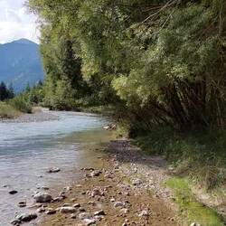 Nach einem kurzen Stop am kleinen Alpsee erreichen wir dann schnell Immenstadt und hier gehen wir frühstücken! Als wir aufbrechen, stehen da plötzlich unsere Zeltnachbarn und meinen, ihr seid aber auch noch nicht weit gekommen!🙃 Kurz hinter Immenstadt erreichen wir die Iller, der folgen wir auf ufernahen Pfaden bis zu einem See, mit Wasserski Anlage! Zu dieser Anlage gehört dummerweise ein Café, mit schöner Terrasse und tollem Blick auf die Wasserski Sportler! Der Kaffee und der Kuchen waren ganz gut und erst in Sonthofen können wir wieder Nahrung aufnehmen! Wir bleiben auch bis Sonthofen an der glasklaren Iller, beobachten eine Raftingtruppe und sehen auch die Vorbereitungen für eine Flossfahrt! In Sonthofen haben wir uns in einer Pension eingemietet, denn es sind wiedermal Gewitter gemeldet! Unser Abendessen besteht heute aus 3 Brötchen, 2 geräucherten Makrelen und 2 Dosen Bier! Diese leckere Mahlzeit verzehren wir gerade auf unserem Zimmer und schauen die Vorberichterstattung für eine weitere Blamage? Morgen wollen, müssen wir früh aufstehen, wenn es geklappt hat, werden wir berichten warum!😁