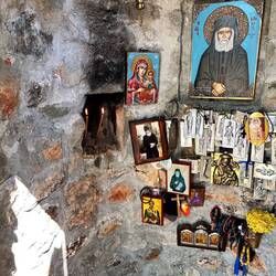 Zuerst ging‘s an grossen Anbauflächen für Getreide vorbei. Etwas langweilig und ich war froh, als es in die Berge ging. Die Strasse wurde spannender und der Belag abenteuerlicher. Also weg vom Gas und schön konzentriert den Schlaglöchern ausweichen. Ausser den üblichen umherstreuenden Hunden war wieder kein Lebewesen zu sehen. Ich realisierte, dass ich gerade auf der E-90 fuhr, dass ist eine Europastrasse, die sich von Lissabon bis zur türkisch-irakischen Grenze erstreckt. Die Strasse folgte lange breiten Flussbetten mit nur kleinen Rinnsalen. Bevor ich zu meinem ersten Highlight abzweigen konnte, musste ich noch dringend tanken. 20 km Umweg aber kein Problem. Ich hatte ja genügend Zeit. Zurück rauf zur Abzweigung (Video) und auf einer erstaunlich gut ausgebauten Nebenstrasse hinab zu einem Fluss, über eine Brücke und auf der anderen Seite wieder hoch. Nach ca. 20 Minuten tauchte sie auf: die Baumkirche! Da hat man in einen ausgehöhlten Baum eine kleine Kirche gebaut. Man kann darin nur knapp Platz und es ist auf jeden Fall ein sehr spezielles Gefühl da drin zu stehen. Der Ort liegt wirklich im Nirgendwo und es ist total friedlich dort.