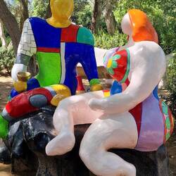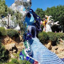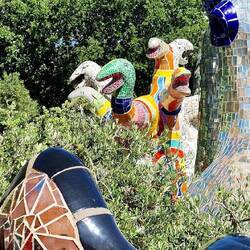 Bald sassen wir wieder auf unseren Maschinen und waren auf der Landstrasse in Richtung Meer unterwegs. Wir wollten das Dorf Porto Ercole auskundschaften oder ehrlicher einfach am Meer mittagessen ;-). Auch dieser Zwischenhalt war ein Glücksgriff, denn es hatte nicht viele Menschen, das Wetter war toll und alles total entspannt. Lecker am Hafen mit Blick auf das Wasser gegessen und wieder ein Stück der Route zurück, denn wir wollten den Tarot-Park von Nikki De Saint Phalle in der Nähe von Capalbio besuchen, dessen Besuch uns eine Freundin empfohlen hat. Niki De Saint Phalle ist die Künstlerin, die den Schutzengel im HB Zürich geschaffen hat, den jeder Pendler kennt; ein zartes Geschöpf von 11 Meter Länge und 1,2 Tonnen Gewicht, das über unseren Köpfen schwebt.