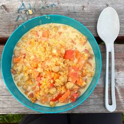 Abends kam ich ganz zufällig zu einem kleinen Campingplatz, der mir bei Google gar nicht angezeigt wurde. Das war perfekt, weil ich dort unter einem Überdach kochen konnte, da es regnete🌧️
