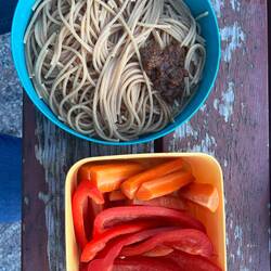 Ich hörte Podcast und genoss das Rad fahren. Abends suchte ich mir ein Platz zum Zelten, was gut klappte. Ich kochte Nudeln mit Pesto und Gemüse 🍝🥕🌶️