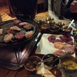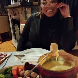 Terminando el recorrido pasamos a un rodizio de fondue. Consiste en una secuencia de queso derretido con cosas para untar: polenta frita, papa, brócoli, zanahoria, etc. Luego, el segundo tiempo, viene una plancha de piedra donde uno mismo puede poner a asar carnes, condimentarlas, polerles queso derretido o alguna de las muchas salsas que pusieron en la mesa.