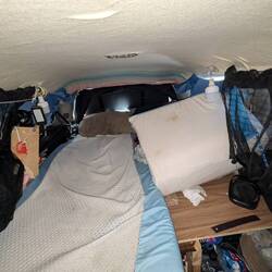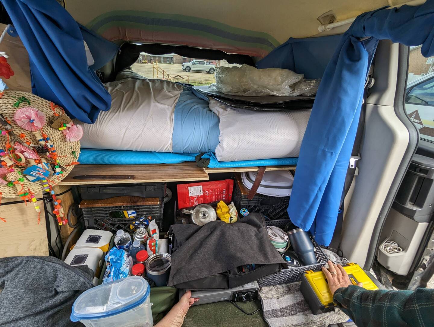 We left sitting room between the bed and front seats. We built wooden lids for the milk crates so they could be used for storage and seats. Dwayne still uses his that way. I prefer the floor, with myLeer más