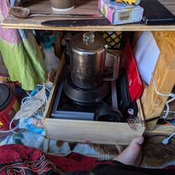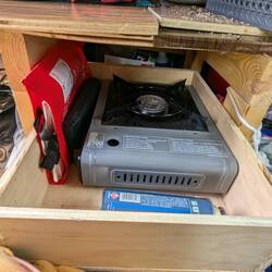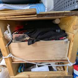 2023 - The square table in the middle was planned as a set of kitchen drawers. It holds the weight of the bed when extended, so the empty box was part of the original build.