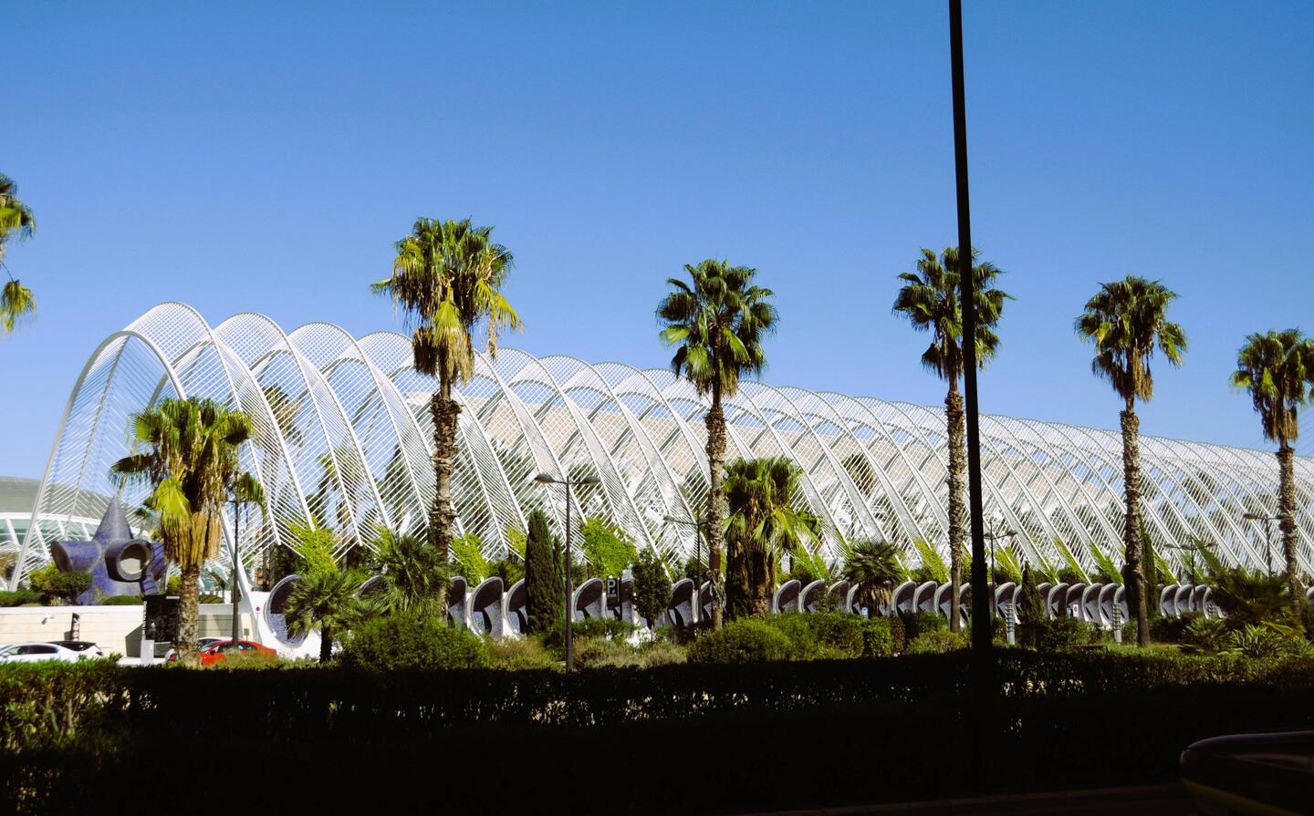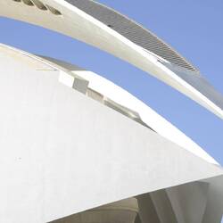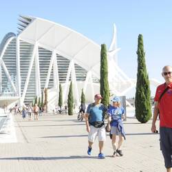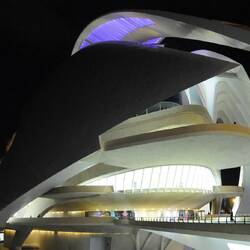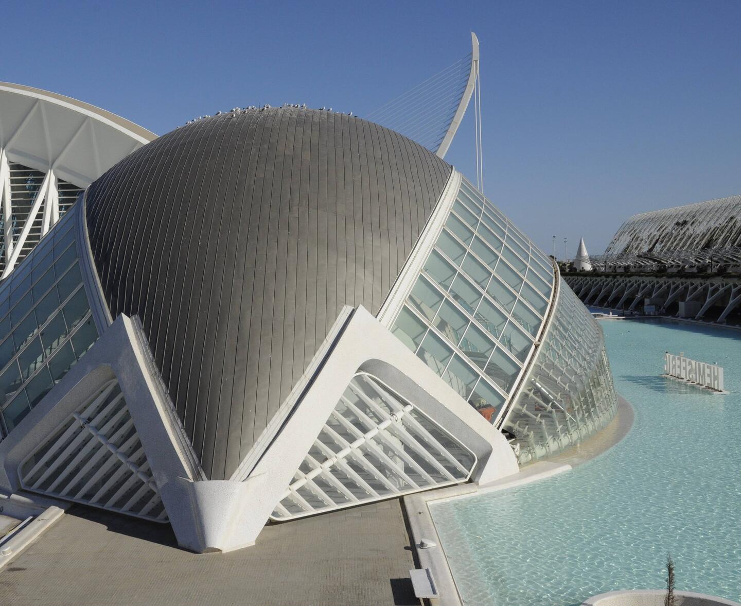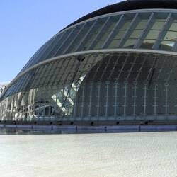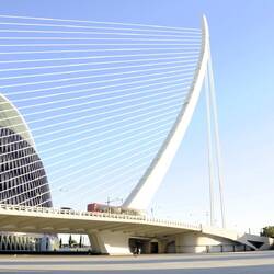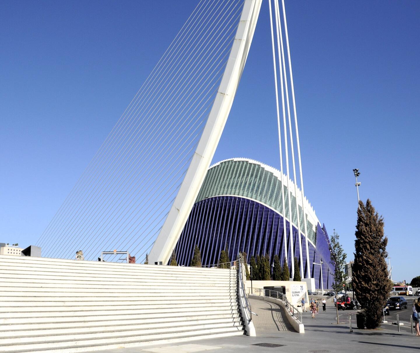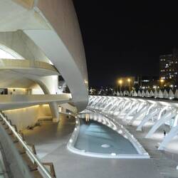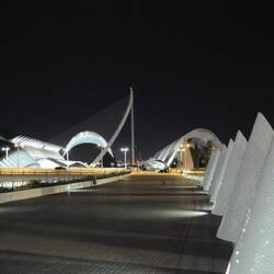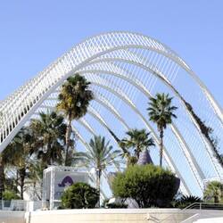 320 Meter lang, 60 Meter breit, Portal als Eingang zur „Stadt der Künste und Wissenschaften“. Mit von 55 fixierten und schwebenden weißen Bögen überdacht.