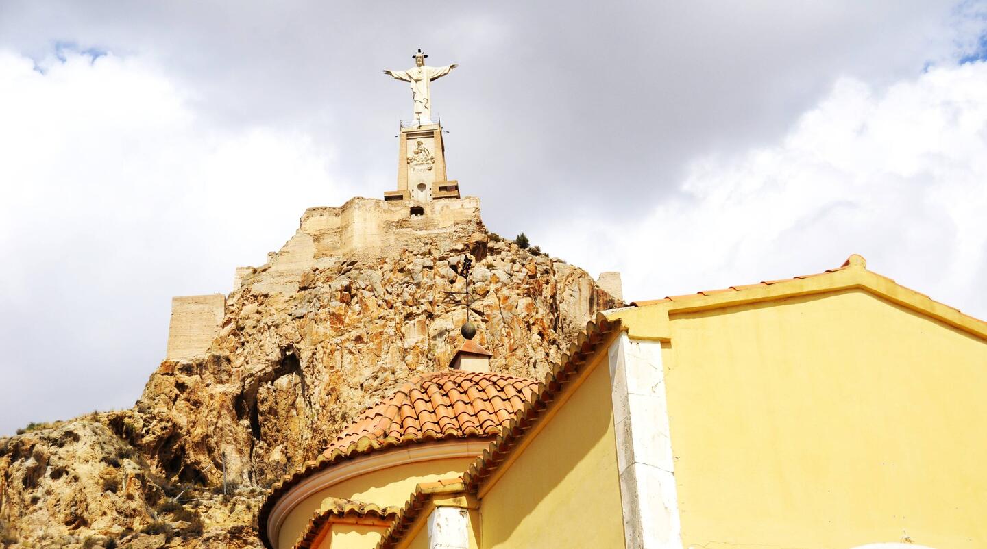 Weit hin in der Ferne um Murcia sichtbar, der Christus von Monteagudo. Er steht auf einem beeindruckenden Felsberg.