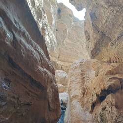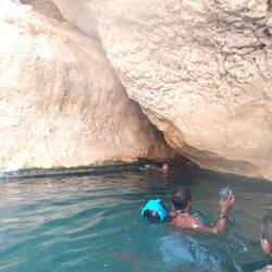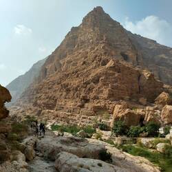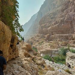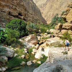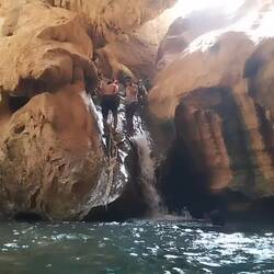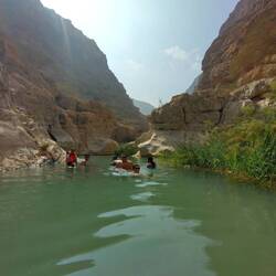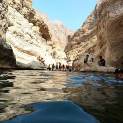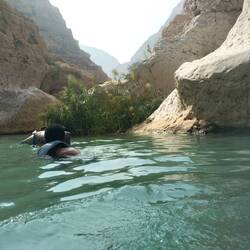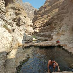 Morgens um 8 (!😴) auf ins Wadi Shab (Wadi für temporäres Flussbett, Shab heißt es eben 🤓). Nach knapp 2 Stunden im Minibus gehts erstmal kurz aufs Boot, hinter die ganzen Wasserpflanzen bringen lassen und dann zu Fuß eine gute Stunde einen mehr oder weniger befestigen Trail entlang, der echt nicht ohne ist - vor allem wird's dann wirklich anstrengend so in der Mittagssonne 🥵. Das geschafft wird dann alles abgelegt, was man nicht mehr braucht und rein in den ersten Pool. Wo es dann teils schwimmend, teils auf Zehenspitzen teils such wieder kletternd weiter geht zum nächsten Pool und so weiter bis zur Höhle. Der Eingangsspalt lässt an der engsten Stelle wirklich nur den Kopf durch. Das kostet echt Überwindung, lohnt sich aber voll