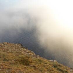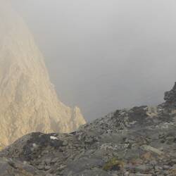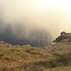 Die Sicht auf die Klippen, die Barentssee - ein Teil vom Nordpolarmeer - und die gigantische Landschaft sind leider vernebelt, was oft vorkommen soll. Vom Nordkapp Plateau geht es 307 Meter in dieLeia mais
