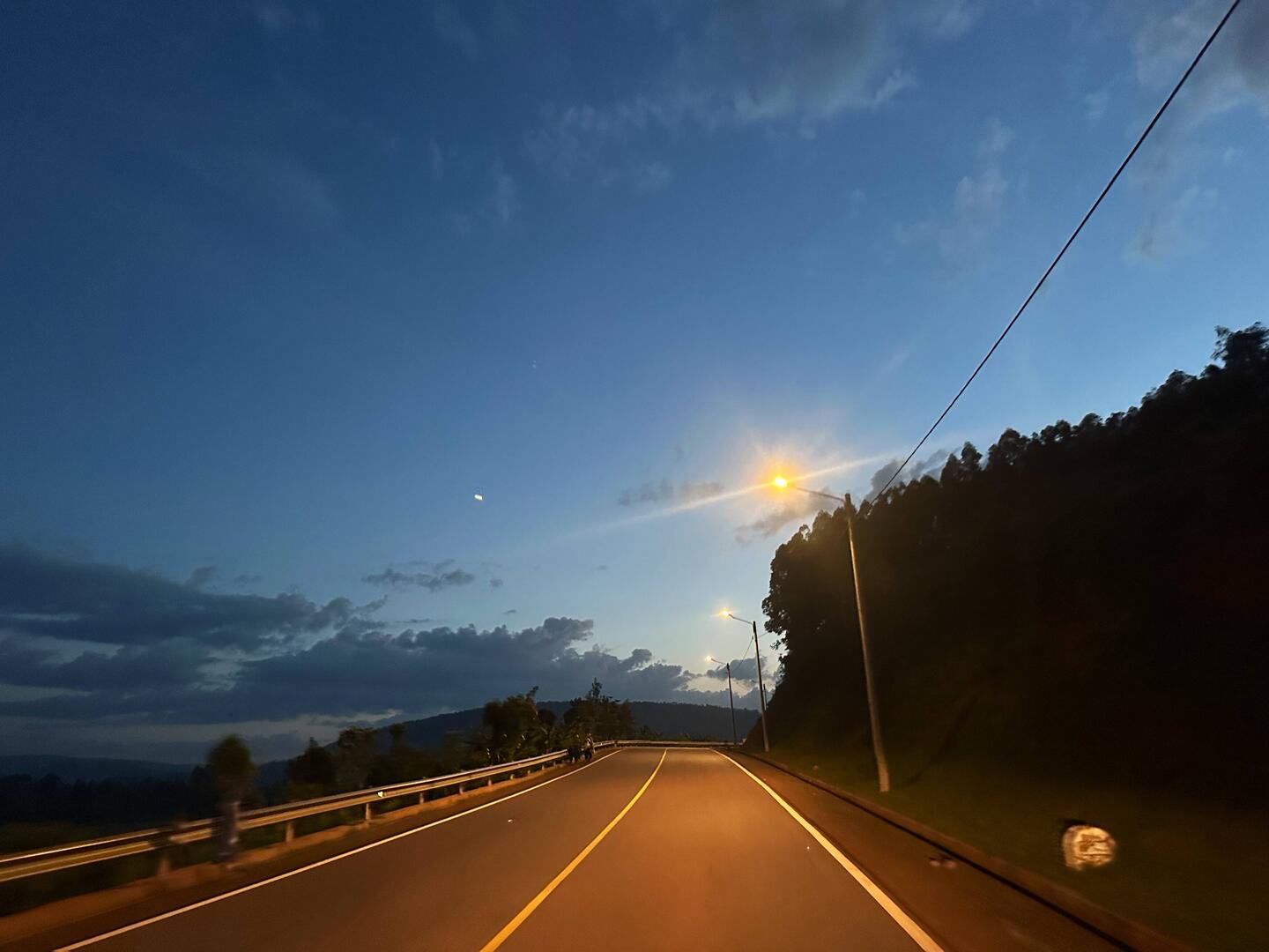 Direkt am ersten Abend in Ruanda fahren wir bis in die Dunkelheit, denn wir finden keinen Wildcampplatz. Und während wir durch die dicht besiedelte Landschaft rollen, wird schnell klar warum: Überall Menschen, Häuser, kleine Läden. Die neuen Straßen sind zwar gut beleuchtet, haben aber an den Seiten tiefe Gräben, sodass man kaum irgendwo abbiegen kann. Feldwege gibt es fast keine, und wo einer wäre, verhindert der Graben die Zufahrt. Schließlich erreichen wir eine kleine Stadt und gönnen uns etwas zu essen. Hähnchen, Pommes und Spaghetti ist das einzige, was es gibt. Zudem probieren wir den einheimischen Milchtee – sehr süß. Auch hier werden wir insbesondere wegen Marie angestarrt. Hier sind „Weiße“ selten.