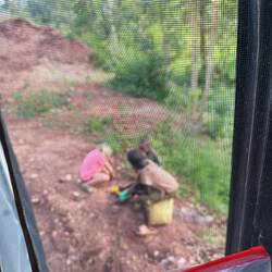 Am Abend finden wir einen Platz mitten im Busch. Kein Mensch weit und breit, nur trockenes Gras, Grillenzirpen und der weite Himmel über uns. Wir machen Feuer, kochen Tee, und dann passiert es: Maries Ball rollt ins Feuer. Ein kurzer Moment, ein Schrei, dann Stille. Der Ball schmilzt, das Feuer knistert. Marie weint kurz, dann lacht sie wieder. Es ist nur ein Ball – und trotzdem spüren wir, wie alles hier ein bisschen zerbrechlicher ist.