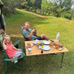 Zwischendurch machen wir eine Kaffeepause. Marie liegt auf der Rückbank und schläft – die vielen Stunden Safari sind ihr etwas zu langweilig. Regina fragt den Guide, ob wir am Ende vielleicht noch einmal beim Leoparden vorbeischauen können. Und tatsächlich: Auf dem Rückweg fährt er noch einmal dorthin.