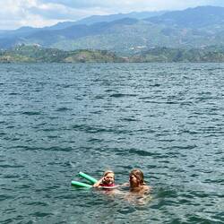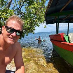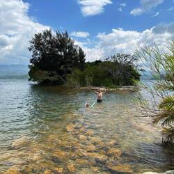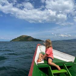 Wir springen direkt in den See. 25 Grad, glasklar, friedlich. Marie will kaum wieder heraus, und uns geht sofort das Herz auf. Der Ort tut gut. Am nächsten Tag bleiben wir noch. Mit Patrick laufen wir zu einer kleinen Kaffeefarm um die Ecke. Er kennt hier jeden, erzählt viel über das Leben am See und wie er zwei Brücken für das Dorf gebaut hat, damit die Wege besser zu befahren sind. Den Kaffee, den wir dort kaufen, serviert er selbst seinen Gästen – kräftig und aromatisch.