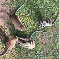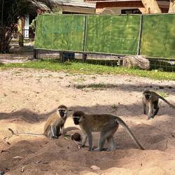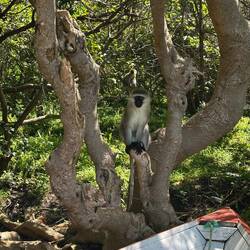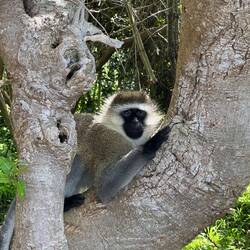 Weiter geht’s zu einer anderen Insel, auf der Vervet Monkeys leben – Meerkatzen, die einst ausgesetzt wurden und sich nun zwischen dichten Mangobäumen heimisch fühlen.