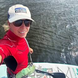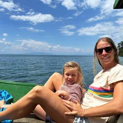 Am nächsten Morgen macht Regina noch Sport am Steg, während die Sonne über dem See aufgeht. Danach springen wir erneut ins Wasser, genießen die Frische und die Ruhe des zweiten Tages.