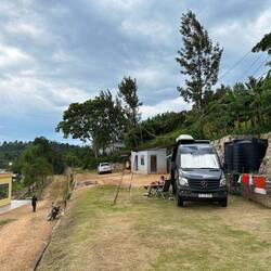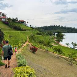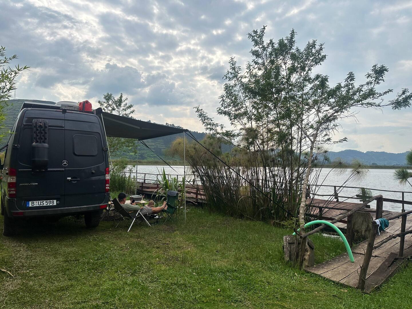 Eigentlich wollen wir einen Wildcampspot nördlich des Lake Kivu erreichen, direkt am Wasser. Doch die Straße wird neu gebaut, ist gesperrt und schlicht unpassierbar. Wir müssen also spontan umplanen. Stattdessen fahren wir zu einem kleinen Campingplatz, den ein Belgier direkt am See aufgebaut hat.