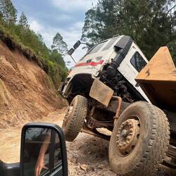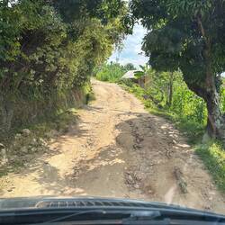 Die neue Straße ist zunächst gut, doch sobald wir von der Hauptstraße abbiegen, wird es mit jedem Meter steiler und schlechter. Zwei Kilometer geht es bergab, ein Vulkansee eben, rundherum nur Berge. Geröll, ausgewaschene Rinnen, enge Kurven. Jens ist angespannt und fragt sich, wie wir jemals wieder hochkommen sollen. Regina steigt immer wieder aus, hebt tiefhängende Stromkabel mit der Leiter hoch und läuft mit dem Walkie-Talkie voraus, um die Route zu prüfen. Wir fahren im Schritttempo hinunter, und eine Gruppe Kinder läuft winkend hinter uns her, neugierig und voller Energie.