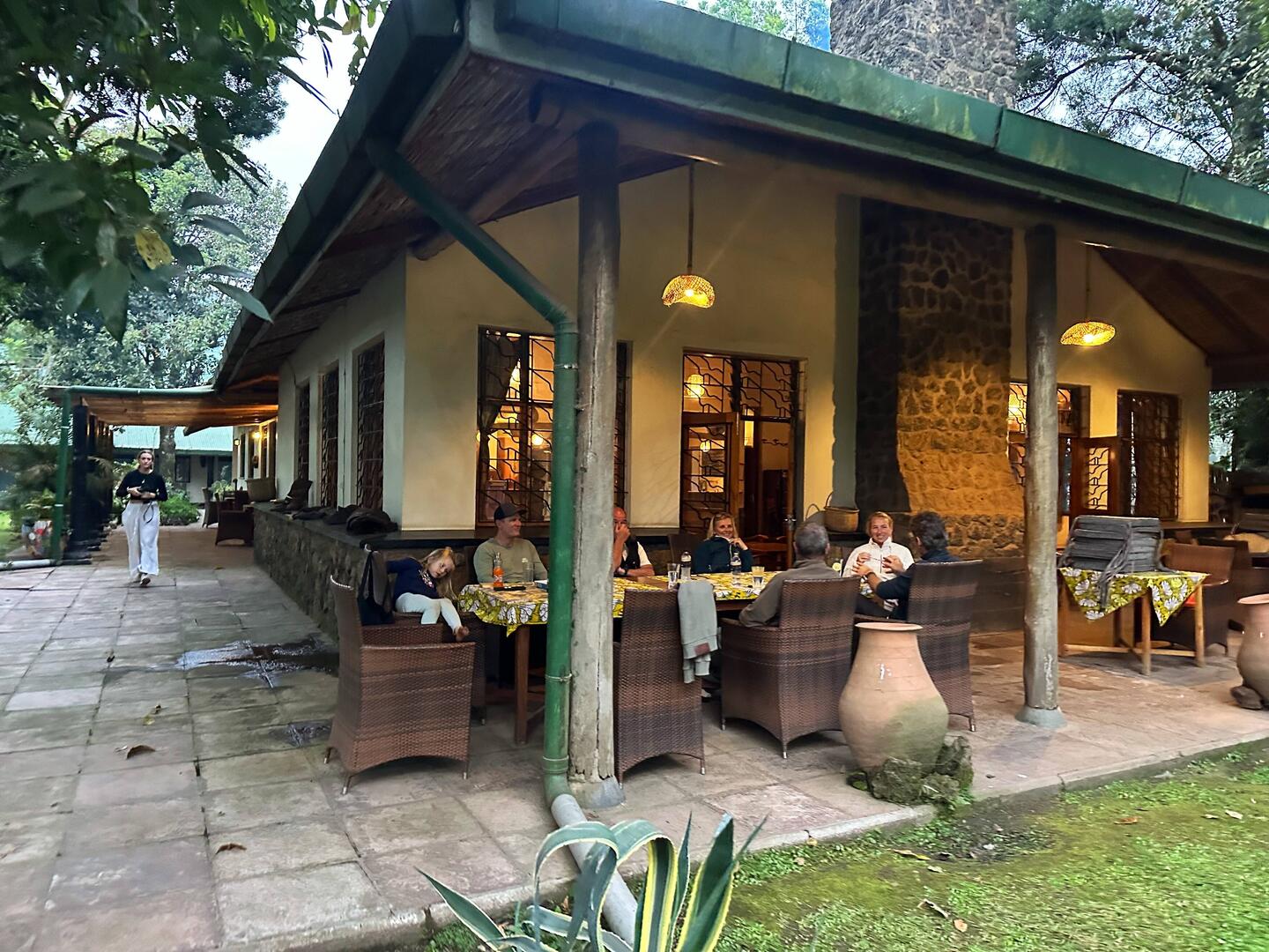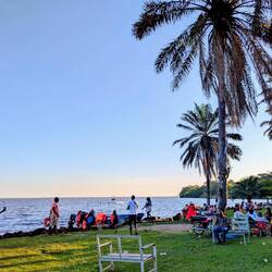 Und plötzlich sitzen wir alle zusammen wie eine zufällige, bunt gemischte Reisegemeinschaft, die sich genau am richtigen Moment trifft. Über uns starten Hunderte Flughunde in die Dämmerung – es sieht aus wie ein schwarzer, fließender Strom am Himmel. Marie ist sofort verliebt in Annika, die junge Filmemacherin, und die beiden spielen und lachen, als hätten sie sich schon immer gekannt. Regina unterhält sich mit Claudia, der Reiseleiterin, die eigentlich aus Deutschland kommt, aber seit 18 Jahren in Südafrika der Nähe des Krüger Nationalparks lebt. Jens unterhält sich derweil mit den drei deutschen Männern die mit ihren Miet-Geländewagen bereits 2 Wochen durch Uganda gefahren sind und sich hier der Frauengruppe anschließen. Wir merken, wie gut es tut, mal wieder mit Leuten zusammenzusitzen, Geschichten auszutauschen, zu lachen.