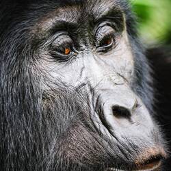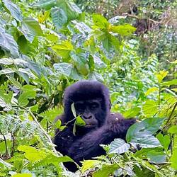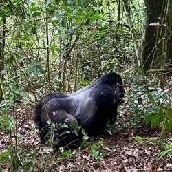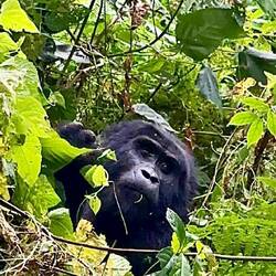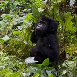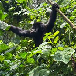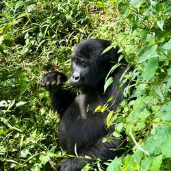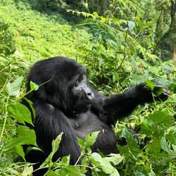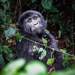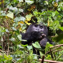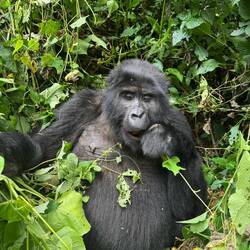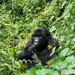 Nach etwa anderthalb Stunden taucht plötzlich ein kleiner Gorilla direkt vor uns im Baum auf – kaum zwei Meter entfernt. Unter ihm klettert ein Weibchen den Hang hinunter, und etwas weiter unten thront er, der mächtige Silberrücken. Unser Tracker schlägt uns mit der Machete den Weg frei, um den Gorillas folgen zu können. Der Wald wird dichter, der Boden steiler, und wir halten alle den Atem an, als wir ganz nah an die Tiere herankommen. Sie registrieren uns – und bleiben erstaunlich gelassen.