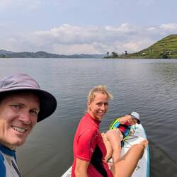 Später pumpen wir das Stand-Up-Paddle-Board auf und padeln gemeinsam über den See. Die Wasseroberfläche ist ruhig wie Glas, und als wir weiter hinauspaddeln, öffnet sich der Blick hinüber auf die Berge der Demokratischen Republik Kongo. Ein Bild, das sich tief einprägt: wir drei auf dem Board, der See unter uns, die fernen Hügel im Abendlicht.