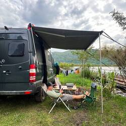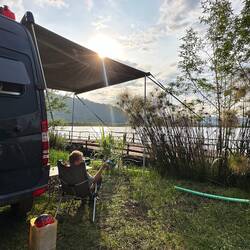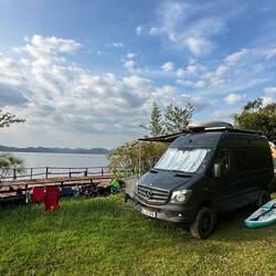 Dann erreichen wir den Platz – ein schlichtes, aber liebevolles Grundstück am Hang, Stellfläche oben, unten der See mit kleinem Strand. Kein klassisches Camping, aber ein traumhafter Ort mit Toilette, Wasser und einem unglaublichen Blick. Der Besitzer zeigt uns alles; er lebt seit 2019 hier und hat sich sein eigenes kleines Paradies geschaffen.