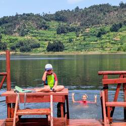 Der Mutanda-See empfängt uns kühl und erfrischend. Die kleine Badestelle lädt sofort zum Reinspringen ein, und Marie ist kaum noch aus dem Wasser zu bekommen. Sie lacht, spritzt, taucht, und wir springen fröhlich hinterher.
