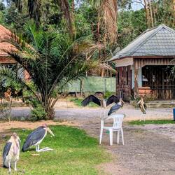 Am Morgen entschädigt uns die Natur: Affen, Karibus und Marabus laufen direkt vor dem Camper vorbei, suchen nach Futter und beobachten uns neugierig. Ein friedlicher, schöner Start in den Tag – und ein Moment, der die ganze Aufregung wieder ein bisschen vergessen lässt.Read more