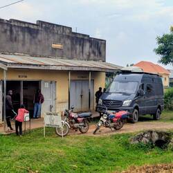 Die Polizistin sag, dass wir hier nicht stehen können. Wir sollen doch besser zur polizeistation mitkommen. Dort wäre es sicher. Na gut. Wir fahren mit. Bei der Polizeistation handelt es sich aber eher um eine Polizeihütte – ein lauter Ort direkt an der Straße. Marie findet kaum in den Schlaf, Regina bekommt Bauchschmerzen, und die Nacht wird unruhig. Am Morgen stehen schon viele Menschen und Mopeds um den Sprinter herum. Statt zum See zu fahren, müssen wir erst zum Commander nach Masaka.