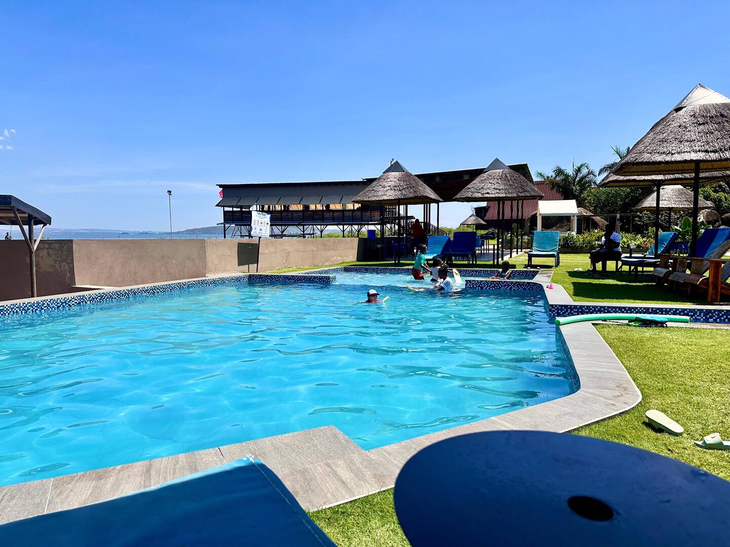 Ein Häuschen, ein grüner Garten mit viel Schatten und ein Pool – genau das Richtige nach der Fahrt. Neben uns parken Belgier im Land Rover, auf der anderen Seite stehen Schweizer mit einem Toyota Land Cruiser. Wir springen direkt in den Pool und genießen die Abkühlung. Marie übt fleißig schwimmen. Sie macht schon richtig Fortschritte.