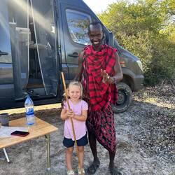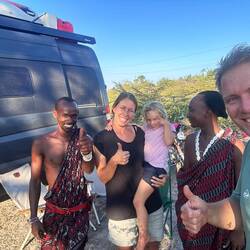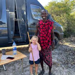 Die erste Nacht verbringen wir ruhig im Busch. Die zweite Nacht stehen wir bei den Massai. Zwei von ihnen, Pedro und Samuel, kommen vorbei. Samuel spricht nur Swahili, Pedro übersetzt und erzählt uns viel über die Kultur der Massai – über ihre Kleidung, deren Bedeutung und ihr Leben mit den Herden. Besonders beeindruckt uns, dass Pedro als Doktor arbeitet und seine Medizin aus der Natur herstellt. Später spielen Jens und Marie sogar noch Fußball mit einem weiteren Massai. Die Nacht ist ruhig und herzlich.